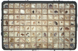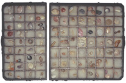 また,漆塗りの箱の外側を飾る貝殻をあわせて,貝の種類は金子寿衛男氏と梶山氏によって同定され,腹足類(巻貝)73科249種,掘足綱1種,二枚貝綱38科141種,頭足綱1科2種,多板綱1種に及ぶ.これらの貝は,海棲,淡水棲,陸棲のすべてにわたり,海棲種は日本近海だけでなく,南方に分布するもの,前述の大西洋にすむものも含まれ,収集範囲の広さが特筆される. |