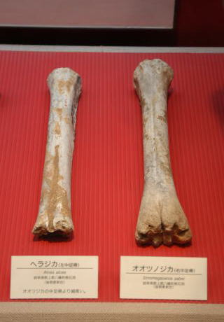ヘラジカ(左)とヤベオオツノジカ(右)の中足骨(ヘラジカの方が細長い);岐阜県八幡町;第四紀更新世