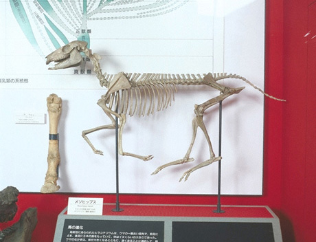 現在のウマは一本指で立ち,走っていますが,漸新世のメソヒップスは三本指のウマでした.始新世にあらわれたヒラコテリウムは,ウマの一番古い祖先で,前足に4本,後足に3本の指をもっていました.その後,ウマのなかまは,体が大きくなるとともに,指の数がへり,草原にすんで,とても速く走る動物に進化しました.