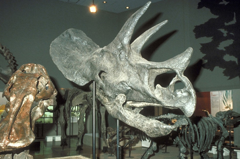 白亜紀後期(約7000年前)に北アメリカにすんでいたツノ竜のなかま。体長は6〜9m、頭骨のうしろの部分が肩をおおうように広がり、目の上に2本、鼻の上に1本、計3本の角はティラノサウルスのような肉食恐竜から身を守るのに役立ったでしょう。口の先はオウムの嘴のようになり、奥に1列の歯があります。草食性。