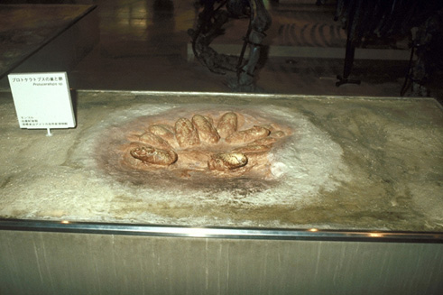 白亜紀後期(約7000年前)に東アジアにすんでいた体長1.5〜2mの小型の恐竜。ツノ竜のなかまでは最も古いので、角といってもまだはっきりした形になっておらず、後頭部の広がりもまだ大きくありません。アメリカやソビエトの探検隊によって、モンゴルからたくさんのプロトケラトプスの化石が発見されました。同心円状に10数個の卵が生みつけられた巣もみつかっています。