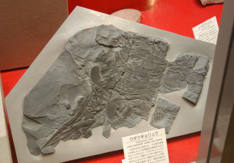 1970年9月に発見され、その後の発掘と研究によって世界最古の魚竜の化石であることがわかり、ウタツギョリュウと命名されました。魚竜としては小型の方で、体長は2mたらず、頭骨は小型です。尺骨・橈骨・掌骨が細長いなど、前肢の骨の形にこの種の原始的な特徴があらわれています。