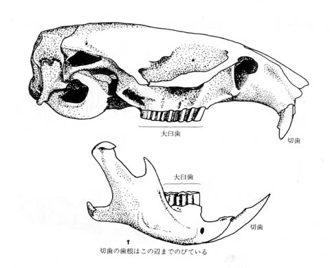 臼歯のエナメル質には、上下にはしる、たくさんのひだが見られます。咬合面では、すりへったエナメル質が、たくさんの三角形をえがいています。これは、植物をすりつぶすのに、つごうのよい形です。臼歯も切歯と同じように、根がなく、一生のびつづけるので、歯がすりへっても平気です。