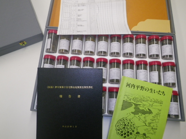 ボーリング標本とボーリング調査報告書 あるいは、近隣の市営住宅等の工事で掘削されたもの。 地質断面図(学校の立地地域を含むものを準備します) ボーリング標本や資料についての簡単な解説 大阪市立自然史博物館特展解説書「河内平野の生いたち」 上町台地より東側の、河内平野の地質断面図が載っています。 大阪平野のおいたちに関わる自然史博物館の展示品の写真と解説 |