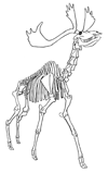 オオツノジカの特徴は,なんといっても大きな角と大きな体です.この標本では,肩の高さ1.8m,体長(頭胴長)2.6mあります.熊石洞の標本をはじめ日本のオオツノジカは,ヤベオオツノジカという種類です.外国には別の種類のオオツノジカがいました.ヨーロッパのオオツノジカの中には,角がとても大きくて,左右の巾が3.5mもあるものまで見付かっています.これでは速く走れなかったのではないでしょうか.