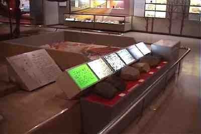 大阪の近くでざくろ石がとれるのは,二上山です.二上山はおよそ1500万年前にはげしい火山活動をしました.その溶岩の中にざくろ石が含まれています.第2展示室15C「二上山」の「石切場安山岩」の標本に,丸みを帯びたこい赤色の小さな粒がたくさん入っています.これがざくろ石です.