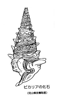 日本各地の、およそ1500万年前の地層から、大形のウミニナのなかまの化石が見つかります。細長い巻貝で、貝がらの周囲には、規則正しくならんだイボのような突起があり、一度見たら宝ものにしたくなるような貝です。近畿地方では、滋賀県けんや兵庫県で化石が見つかっています。この貝はビカリアといい、日本では、新生代第三紀中新世という地質の年代を代表する化石です。ビカリアのなかまは、中新世より古い時代もふくめると、数種類知られています。