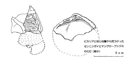 ビカリアの繁栄していた中新世中期きのはじめころ、地質学的にはあっと言う間でしたが、日本の沿岸はかなり暖かく、本州各地の河口域にもマングローブ林がしげっていたことがわかりました。大きなビカリアが、無数に、干潟をはいまわっているようすを思い浮うかべてみてください。