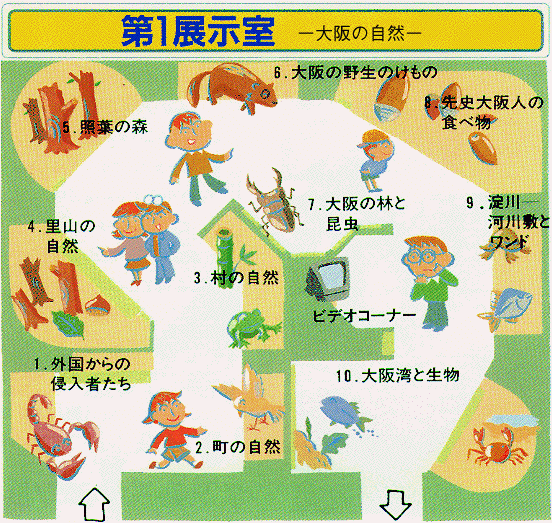 この展示室のテーマは「大阪の自然」です。大阪のもともとの自然が,人間の活動の結果,どのように変化してきたのかを展示してあります。まず最初は街の中の自然,生物は外国から日本に入ってきたもの(帰化生物)ばかりです。つづいて町や村の自然です。田畑や里山にかこまれた自然は,私たちの気分をゆったりさせてくれます。人が伐り拓く前の大阪は照葉樹林におおわれていました。