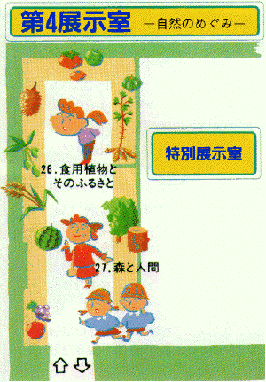 この展示室には,私たちが毎日食べているお米をはじめとする,たくさんの食用植物が原産地別に展示してあります。きのう食べたものが。どこで栽培化されたものか,ご覧ください。地球上のさまざまな地域で,そこにすむ人により,そこにあった野生植物から,栽培植物が選ばれ改良されてきました。私たちの生活は,これらの作物をつくりだした祖先の努力と,それを豊かに実らせてくれる自然のめぐみとによってささえられているのです。