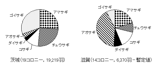 茨城では10ペア以上アオサギがいたコロニーは1カ所だけであったが、滋賀では14カ所中7カ所がアオサギのみのコロニーであり、さらにシラサギ類の繁殖する残り7カ所においてもアオサギが30ペア以上いると推定された。総個体数に占めるアオサギの割合も、茨城では約4%にすぎないが、滋賀では約4割に及んだ(図)。一方、ゴイサギとチュウサギの比率は茨城で滋賀より数倍高かった(図)。