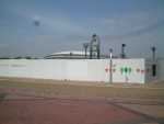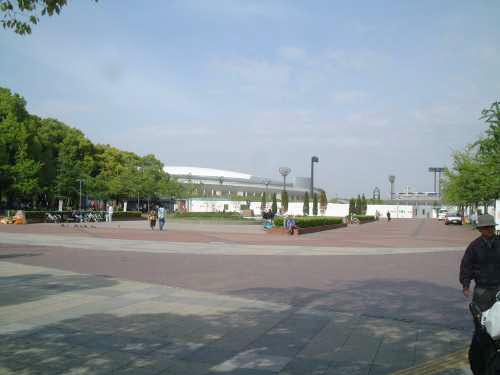 3番出口を出て公園に入ってすぐのあたり正面は長居スタジアム。博物館・植物園は右手。 |