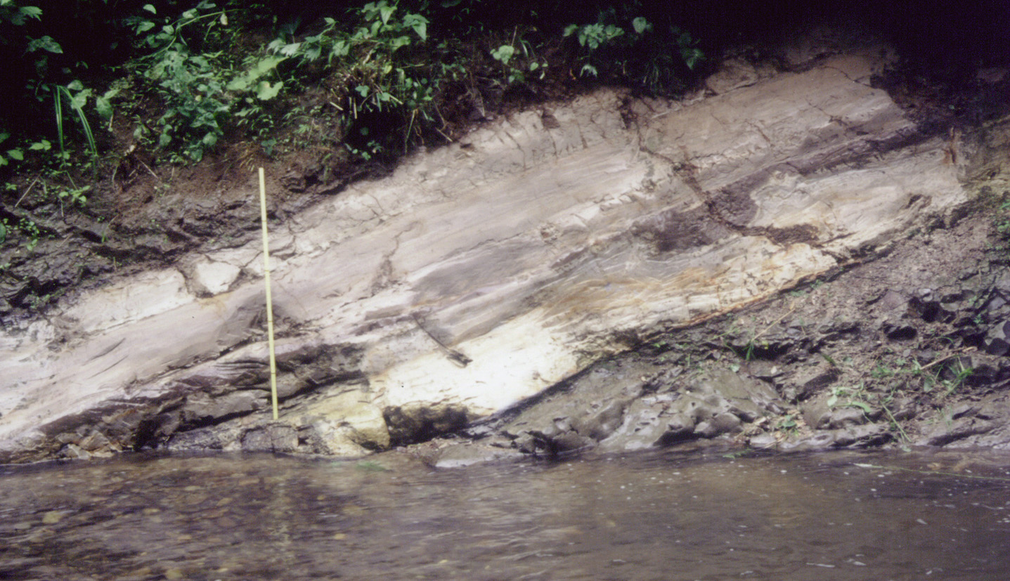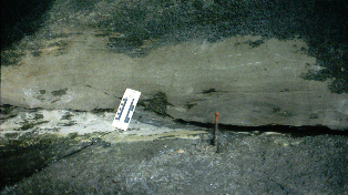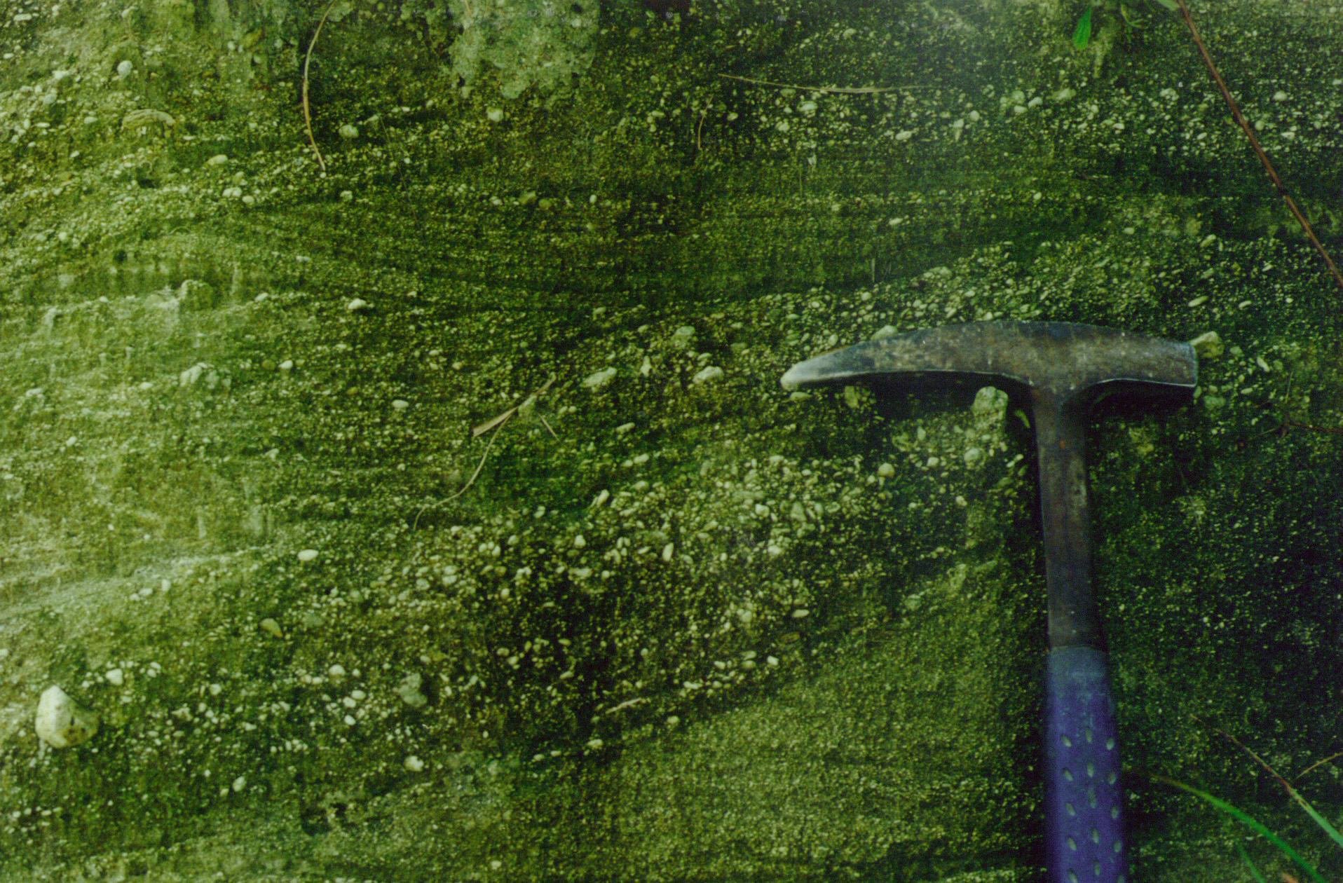 恵比須峠・福田テフラは第三紀と第四紀の境界付近(約176万年前)の地層に挟まれる広域火山灰です.千葉県房総半島の上総層群,新潟県の魚沼層群,三重県の東海層群,滋賀県の古琵琶湖層群,大阪層群など,非常に広い範囲で見ることができます.この火山灰層は非常に厚い再堆積層を伴うのが特徴で,各堆積盆ごとに異なった堆積相をもちます.大阪層群の恵比須峠・福田テフラは,花と緑と自然の情報センターの地域自然誌展示室に実物を展示しています.ぜひ見に来てください.