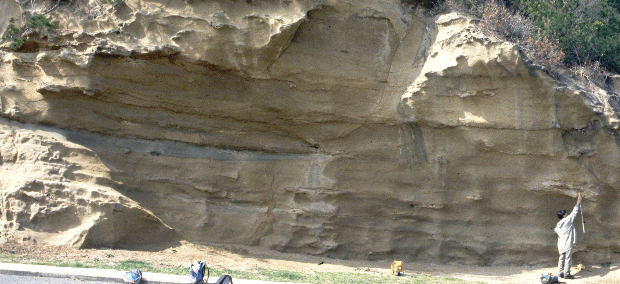 畳ヶ浦砂岩部層.白く見えるのは貝化石の濃集しているところ.