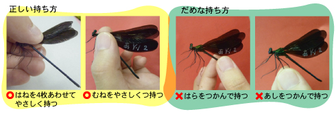 今回、このハグロトンボを対象にマーキング調査を行うことになりました。マーキング調査とは、トンボを捕まえ、翅に印をつけて放す調査方法です。時間をおいてもう一度捕まえることで、芥川のどこに多いのか、好きな環境はどこか、どこからどこまで移動しているのかわかります。