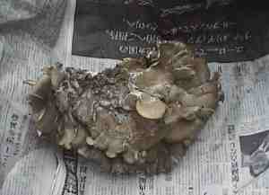 冬場にも,意外にいろいろなキノコが見られます.特に目立つのが木材を腐らせるキノコです.エノキタケやヒラタケなどの有名な食用菌も晩秋から冬まで,街中であってもしばしば見られます.これは豊中市の街路樹の切り株で採集された大きなヒラタケの塊です.採集した大西さんもまさか「しめじ」の名で売られるヒラタケとは思わなかったとのこと.皆さんも近所を見回して見ませんか?食べる場合はよく確かめて,くれぐれも注意して下さいね.食の楽しみは自己責任が原則です.