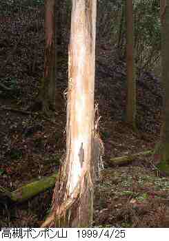 吹田市に在住の方から送られてきた写真です。ポンポン山の北側でシカを調べているときに見つけられたそうです。谷筋の平坦地に生えるスギ50本のうち10数本の皮が、このように剥がれていたそうです。シカではないかと、角や歯の跡を探したけど、見つからなかったそうです。==>詳細画像