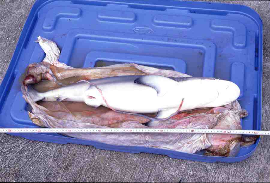 メジロザメの仲間はサメの中でも特に胎生が発達したグループです(卵を産むのではなく,卵は親の体内でかえり子どもで生まれます).このドタブカは8匹の胎仔を持っていました.