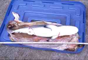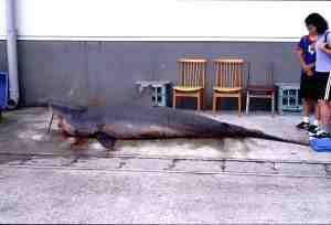 岩屋漁協に引き取らせてくれるよう依頼したところ快諾をいただき,本日さっそく引き取り,内蔵と胎仔*は標本に,皮は展示品にするために剥製業者に預けられました.
