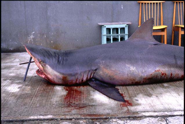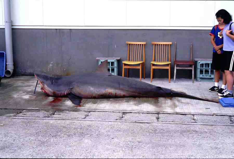 7月13日(火)午前9時過ぎ,兵庫県水産試験場から当館の波戸岡学芸員(魚類担当)に「淡路町の岩屋港に体長3メートル半のホホジロザメが揚った」との連絡がありました.神戸市垂水区沖の明石海峡で操業していた底引き網漁船に掛かったものだそうです.動物研究室で検討し,さっそく「大形のサメの標本を入手する機会はめっにないので,ぜひ欲しい.できれば剥製に仕立てて展示更新時に活用したい.だめな場合は頭部だけでも学術研究用に」と申し入れました実物を同定したところ,ホホジロザメではなくドタブカ(メジロザメ科)であることが判明.ホホジロと比べて口は小さいが,やはり人を襲うことがあります.体長3.25メートル.体重200kg見当.
