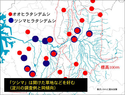 生息環境:オオは平地から山地まで広く分布するが,ツシマは平地の開けた河川敷環境にのみすむ.