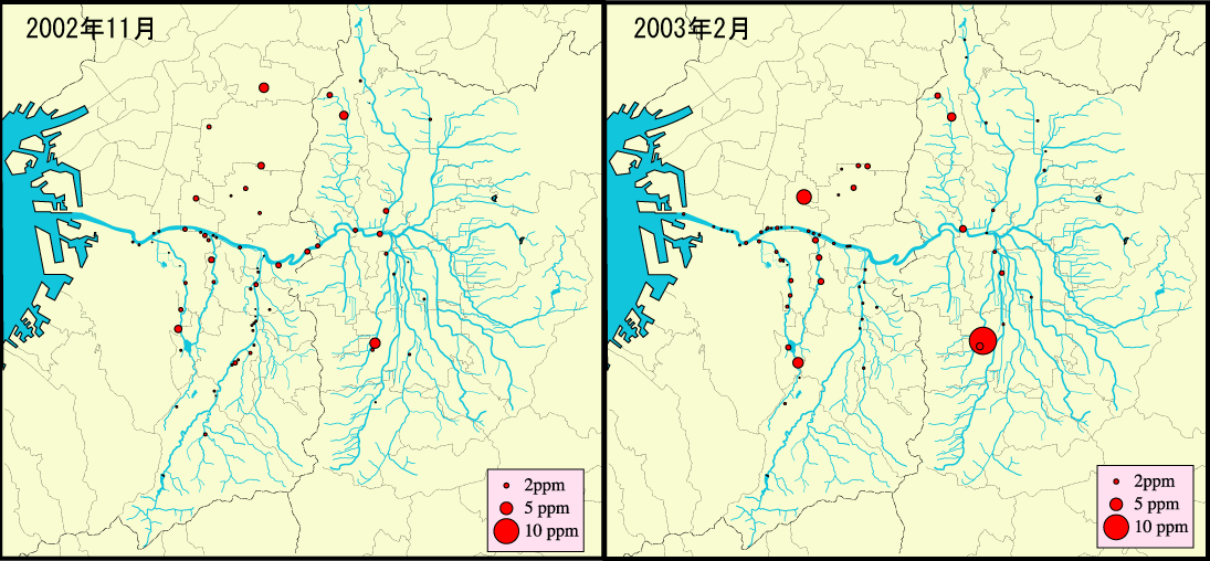 所は11月と似ていますが,全体に検出箇所数が増え,個々の濃度が高くなっています.東除川においては16〜17ppm検出されました.最も高い濃度を示したのは11月と同じく長瀬川で,濃度は20ppm検出されました. 東除川と長瀬川の周囲には住宅・工場が多く,農地が少ないことから,これらの硝酸イオンは農地以外からの供給が考えられます. |