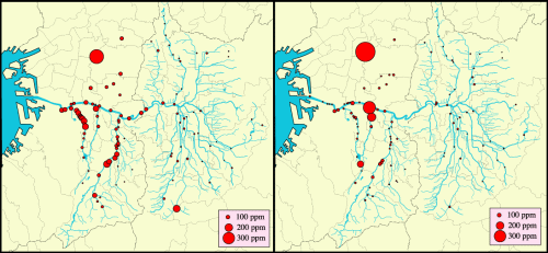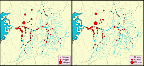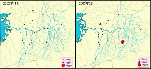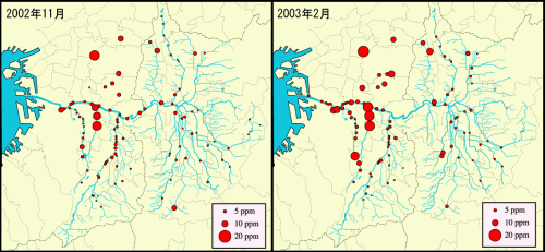 | 塩化物イオンは生活排水中に尿や汗として含まれることもあり,人為的汚染状況を示す目安となることがあります.海からも人口密集地からも遠い奈良県側の上流部には,検出されないところもありました.2003年2月には,東除川下流部で300ppm程度の比較 |