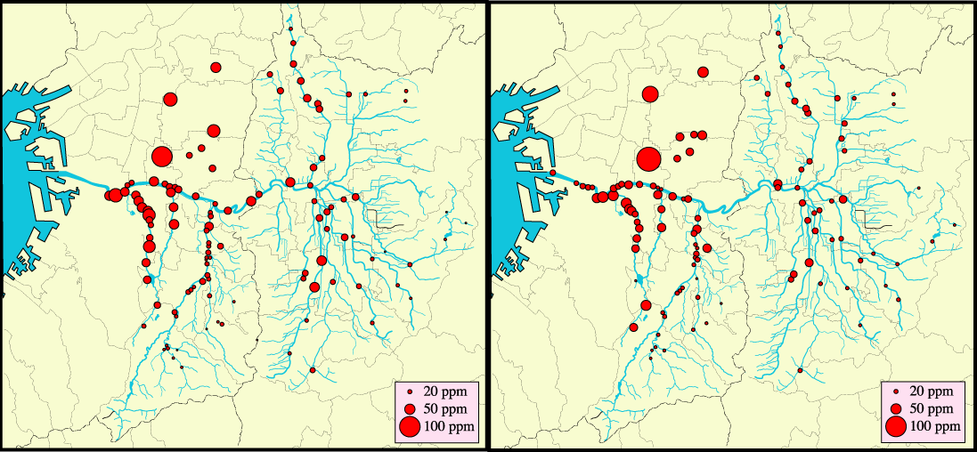 | 硫酸イオンは,一般に石油・石炭の燃焼から発生する硫酸塩が雨に溶けこみ,地上や河川へと流れ込むもの,あるいは工場や家庭排水に含まれ,河川へ流れ込むものがあります.11月の結果では多くの個所で検出されており,各濃度も比較的高くなっています.濃度は周辺に工場が多く分布する旧大和川水系の平野川の100ppmが最大となっています.また奈良県側では検出個所数も大 | 阪よりも少なく,それぞれの濃度もそれ程高くはありませんでした.2月の結果もこれと同様に平野川及び長瀬川といった工場地帯での濃度が目立って高くなっています.これらの結果から,硫酸イオンは工場や家庭からの排水が主な原因になっていると思われます. |