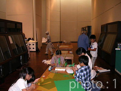 6. こどもワークショップ「いきものぬりえ」の様子。魚を前に一生懸命お絵かき中です。