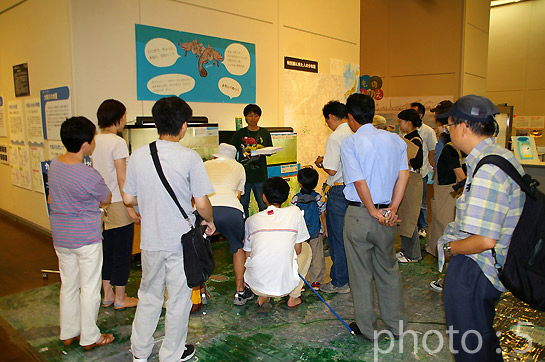 5. 学芸員による展示解説。水槽に展示しているカメにえさをやりながら、大和川の自然について説明しています。