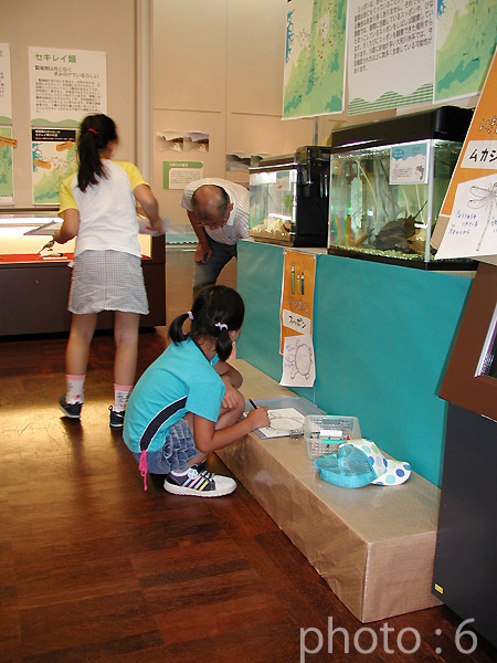 4. 魚、カニ、エビ、貝、カメなど大和川にすむたくさんの生き物を、水槽で展示しました。これはスッポン。
