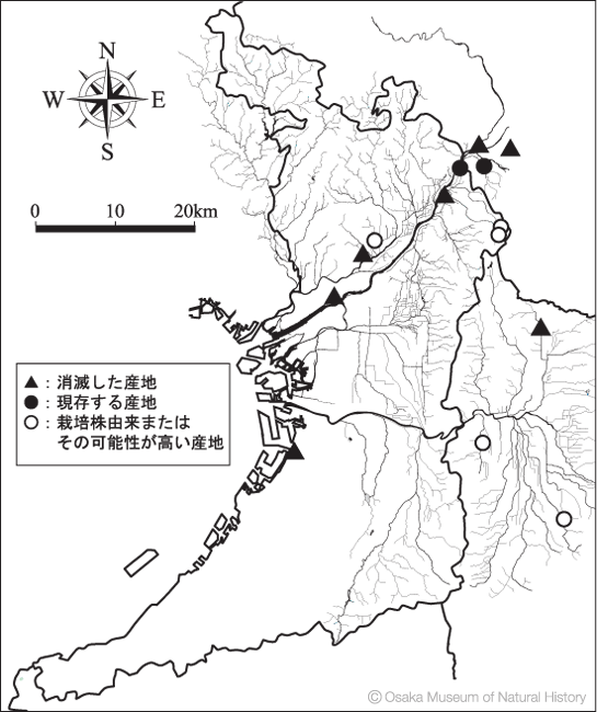 大阪府では淀川水系を含めて絶滅したとされていますが、近年、栽培株の移出とみられる産地の発見が続いています。