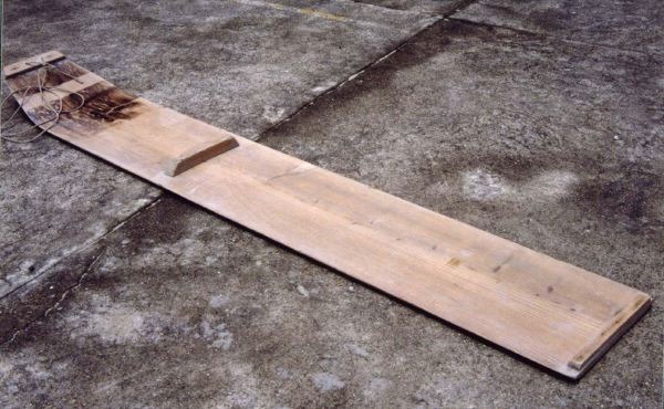 潟スキー.有明海沿岸の人たちが泥干潟で漁をする時に使う2メートルくらいの押し板.前に獲物を入れる桶や漁具を載せ,片膝立の状態で乗り,もう一方の足で泥を蹴りながら干潟に滑り出して行く.地元ではスイタとも言われる.