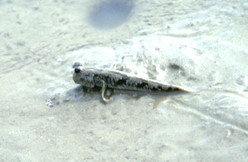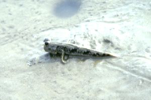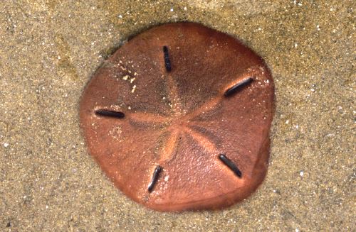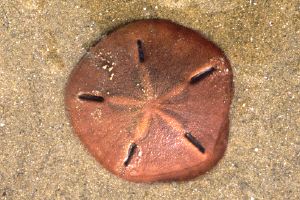 前浜干潟の砂に埋もれて生息する平たいウニ.