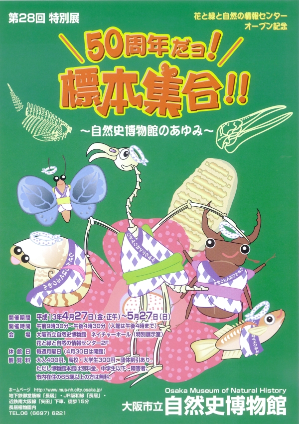 情報センターの2階には大規模な特別展が開催できるネイチャーホールがあり、オ ープン記念特別展として「50周年だヨ! 標本集合!! 〜自然史博物館の歩み〜」を開催します。 自然史博物館が寄贈、採集、購入などによって収集してきた標本は百万点になりま す。さまざまなコレクションごとに代表的な標本を展示し、当館の収蔵標本の全体像 を紹介します。博物館における資料収集・保管事業の意義を知っていただけると思い ます。詳しくはこちら。