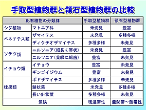 手取型植物群と領石型植物群から産出する植物化石の組成を比較すると表のようになります。共通する種類がなく、異なる気候帯の化石植物群と考えられています。白亜紀始めには被子植物群が出現していましたが、現在までの調査では、手取型植物群と領石型植物群のいずれからも確実な被子植物の化石は発見されていません。