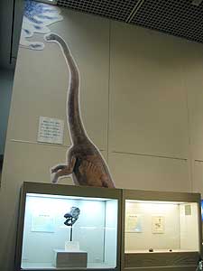 中生代ジュラ紀は、ブラキオサウルスやアパトサウルス(ブロントサウルス)など、巨大で背の高い恐竜があらわれた時代です。体重は10数トンから数10トン、全長20mから30mを超えるものまでありました。この長い首は、高いところの食べ物、つまり高い木の梢の葉を食べるのに都合がよいと考えられます。さらに、ディプロドクスやアパトサウルスは後足で立ち上がって、より高くまで首をのばしていたともいわれています。