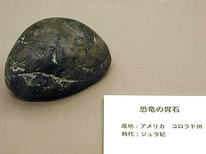 その巨大な体に似合わず、ブラキオサウルスやアパトサウルスなど、雷竜のなかまの頭はウマくらいの大きさしかなく、歯は細くて鉛筆くらいの太さです。これでは、たくさんの植物をすりつぶしてから飲み込むことはできません。そのかわり、雷竜は鳥と同じような砂嚢を持っていたようです。砂嚢の石のはたらきで、丸飲みした植物をすりつぶしていたのです。雷竜の化石が見つかる場所では、その付近では見られいような石が、つるつるに磨かれた状態で、固まりになって地層中から見つかります。このような石は、雷竜が飲み込んで砂嚢にため込んでいた石(胃石)なのでしょう。