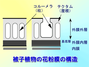 花粉化石は花粉分析という手法が確立しており、連続した化石資料を提供してくれます。被子植物の花粉は、花粉外膜の外層がテクツム(屋根)−コルーメラ(柱)−基底層という層状構造をなすという他の種子植物に見られない特徴をもっています。このような被子植物の最古の花粉化石が、約1億3000万年前のイスラエルやモロッコの地層から知られています。そのころの被子植物の花粉は、単溝型と呼ばれる発芽溝が一つだけあるタイプです。発芽溝を3つもつ3溝型花粉(真正双子葉類,系統樹参照)はおよそ1千万年遅れて現れます。
