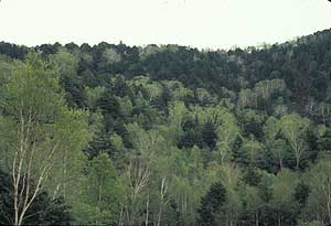 写真は冷温帯最上部の植生。ブナを欠き亜寒帯の針葉樹が混じる(長野県志賀高原)