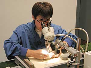 岩石の中に埋まっている新生代の葉の化石を見えるようにするために、化石の上にある岩石を取り除く作業をクリーニングと言います。植物化石の場合、細かな鋸歯や葉脈を壊さないようにするために、実体顕微鏡のもとで、小型のたがね(精密ドライバー)や針を用いて、少しずつ化石を見えるようにします。