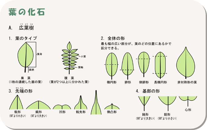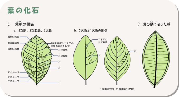 葉の化石は形、葉脈、葉の縁の形、腺点などの付属物に注目して観察します。このような特徴は必ずしも植物図鑑には書いてないので、実物の葉を採集してその特徴をつかんでおき化石と比較する必要があります。