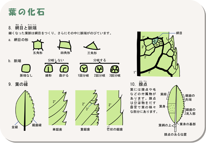 広葉樹の葉脈の網目と脈端、葉の縁の形、腺点