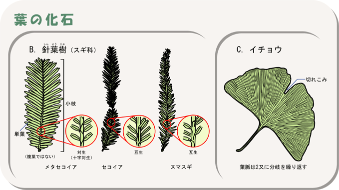 針葉樹(スギ科)の枝とイチョウの葉