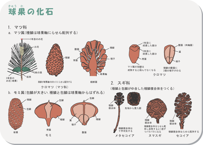 球果はマツやスギのめ花が成熟したもので、マツでいえばマツボックリにあたる部分です。球果の軸に種鱗複合体が配列しています。種鱗複合体は種子と種鱗・包鱗からなり、腹面(球果軸側の面)に種子を付けています。種類によって種鱗と包鱗のゆ合の有無、種鱗複合体の配列や形が異なります。
