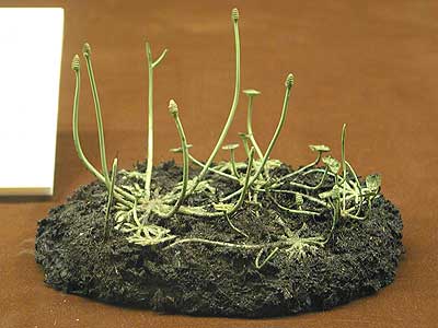 先端が円盤状のものは配偶体、つくしのような形ものは胞子体と考えられている。