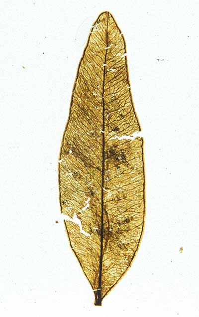 ツゲの葉は丈夫なので植物遺体として残りやすい。2次脈は枝分かれ状に分岐する。葉の縁を縁取る葉脈がある。