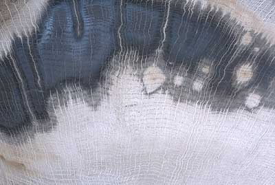 横方向に縞模様が年輪。道管が並んでいるのが見える。縦方向に伸びているのは放射組織。