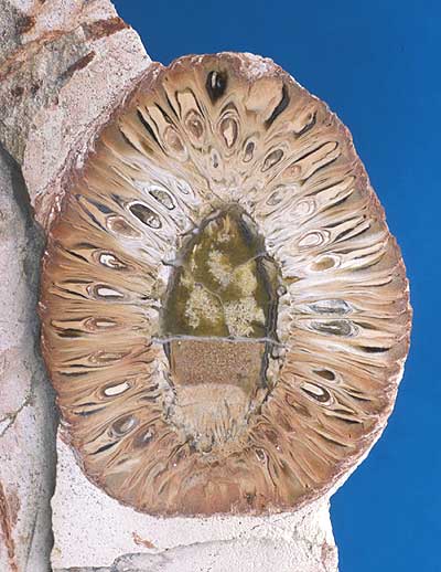 球果軸のまわりに種鱗複合体と種子がついている様子がわかる。種子とその中の胚(白く見える部分)まで保存されている。