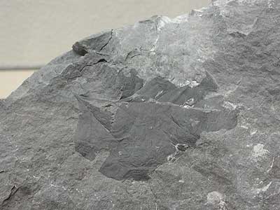 左上が葉の基部。葉の基部から強い3脈が出ている様子がわかる。被子植物であることはわかるが、類縁は不明である。